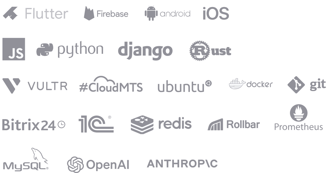 Python, Rust, Django, Flutter, JS, MySQL, Ubuntu, Git, Rollbar, Prometheus, Redis, Docker, OpenAI, Anthropic, MTSCloud, Vultr, Android, iOS, Firebase, 1с, Bitrix24